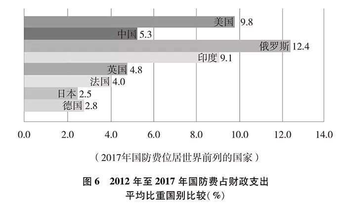 从国防费占财政支出比重看,2012年至2017年,中国国防费占财政支出平均比重约为5.3%,美国约为9.8%、俄罗斯约为12.4%、印度约为9.1%、英国约为4.8%、法国约为4.0%、日本约为2.5%、德国约为2.8%。中国国防费占财政支出的平均比重排在第四位。