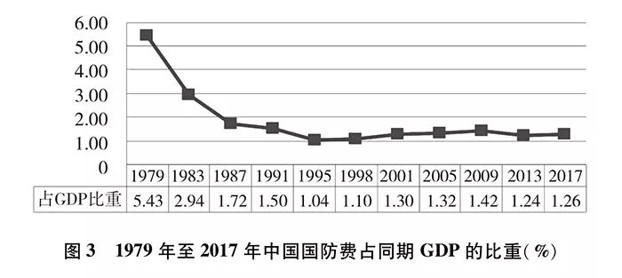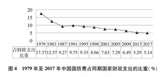 改革开放以来,中国国防开支经历了从维持性投入到适度增长的发展历程,总体保持与国家经济和财政支出同步适度协调增长。国防费占国内生产总值(GDP)比重从1979年最高的5.43%下降到2017年的1.26%,近30年一直保持在2%以内。1979年国防费占国家财政支出比重为17.37%,2017年为5.14%,下降超过12个百分点,总体下降趋势明显。