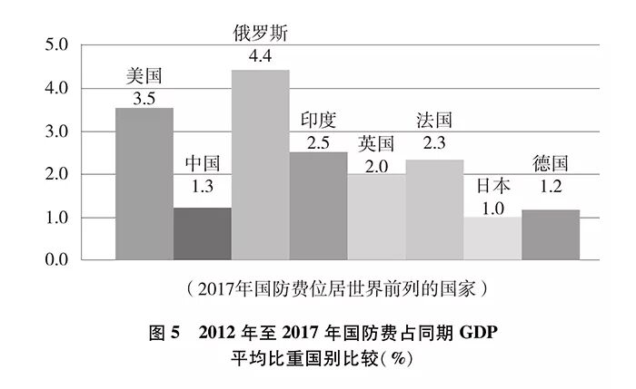 从国防费占国内生产总值比重看,2012年至2017年,中国国防费占国内生产总值平均比重约为1.3%,美国约为3.5%、俄罗斯约为4.4%、印度约为2.5%、英国约为2.0%、法国约为2.3%、日本约为1.0%、德国约为1.2%。中国国防费占国内生产总值的平均比重在国防费位居世界前列的国家中排在第六位,是联合国安理会常任理事国中最低的。