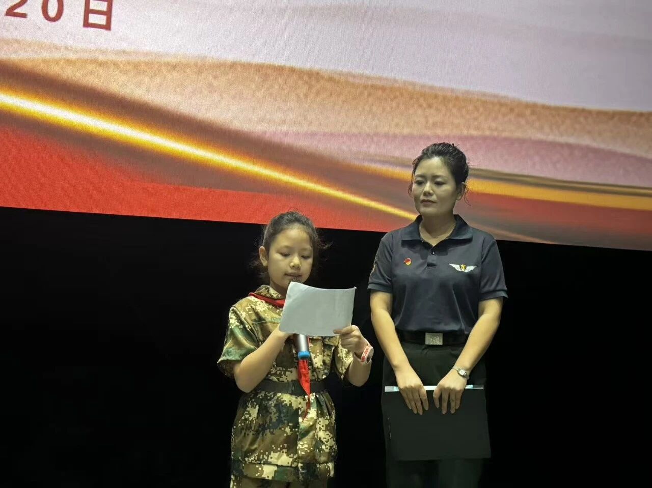 默哀仪式后,“国防小卫士”优秀营员代表王若曦上台宣读全民国防教育倡议书。作为一名多次参与国防公益活动和军事夏令营的小学生,她将国防比作“保护我们的大伞”,呼吁广大青少年积极学习英雄历史、爱护国旗国徽、增强国防观念,争做守护家园的新时代好少年。她铿锵有力的倡议,展现了国防教育在年轻一代中的深厚传承。