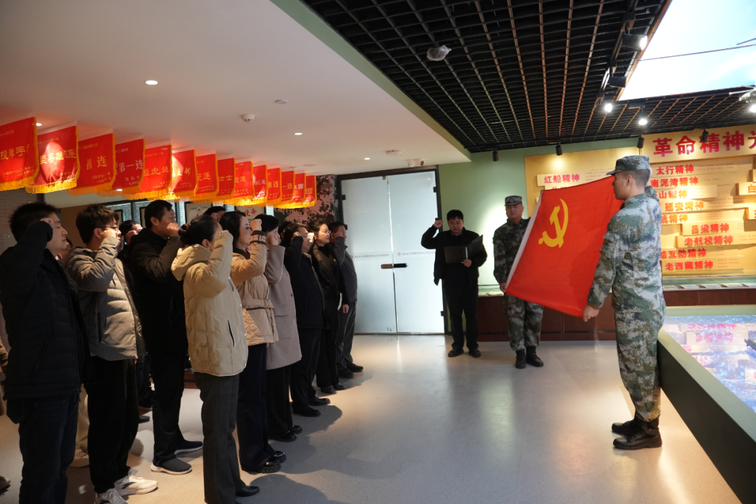 红色精神宣讲环节,宣讲员以"红色基因永传承"为主题,结合一面面承载荣光的战旗,阐释杨根思烈士"三个不相信"的英雄宣言,以及"老虎团"敢打硬仗、能打胜仗的铁血作风。宣讲员深情凝重陈述着革命先烈们在那段艰苦奋斗的峥嵘岁月里不畏强敌、誓死捍卫祖国的英雄壮举,深刻打动着在场每一位党员干部,并引发了强烈的情感共鸣。宣讲结束后,在庄严的氛围中,全体党员面向鲜红党旗,高举右拳,重温入党誓词。铿锵誓言,既是对初心的回溯,更是对使命的郑重承诺。